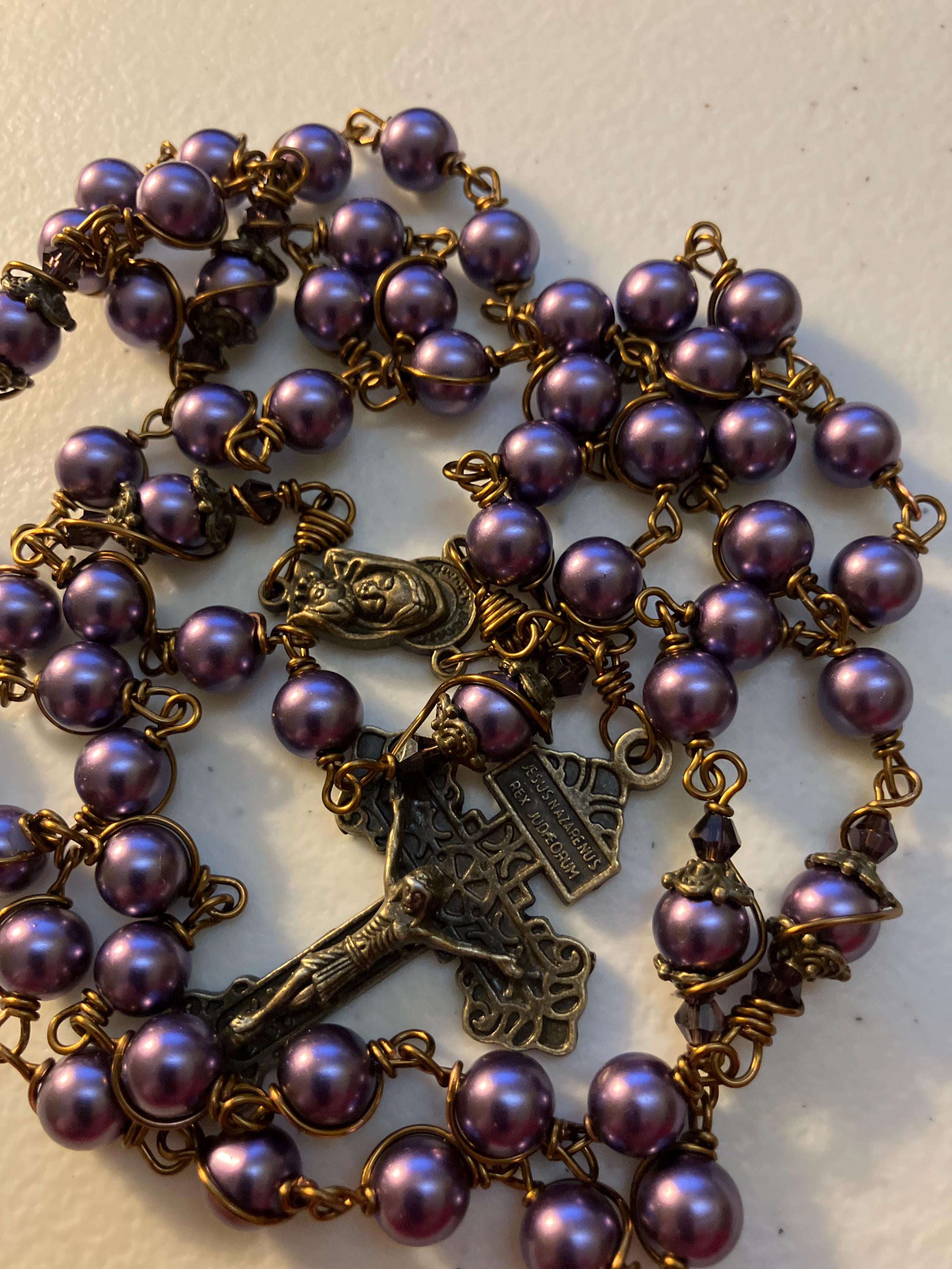 This beautiful handmade rosary is made with 8mm purple glass pearls, bronze beads cap and 2” Pardon crucifix.