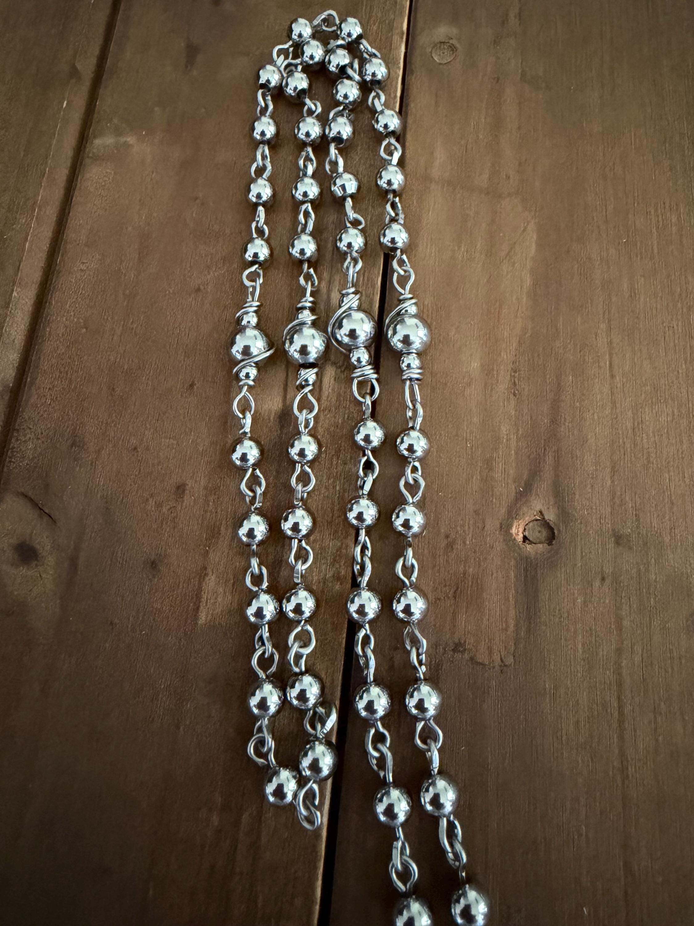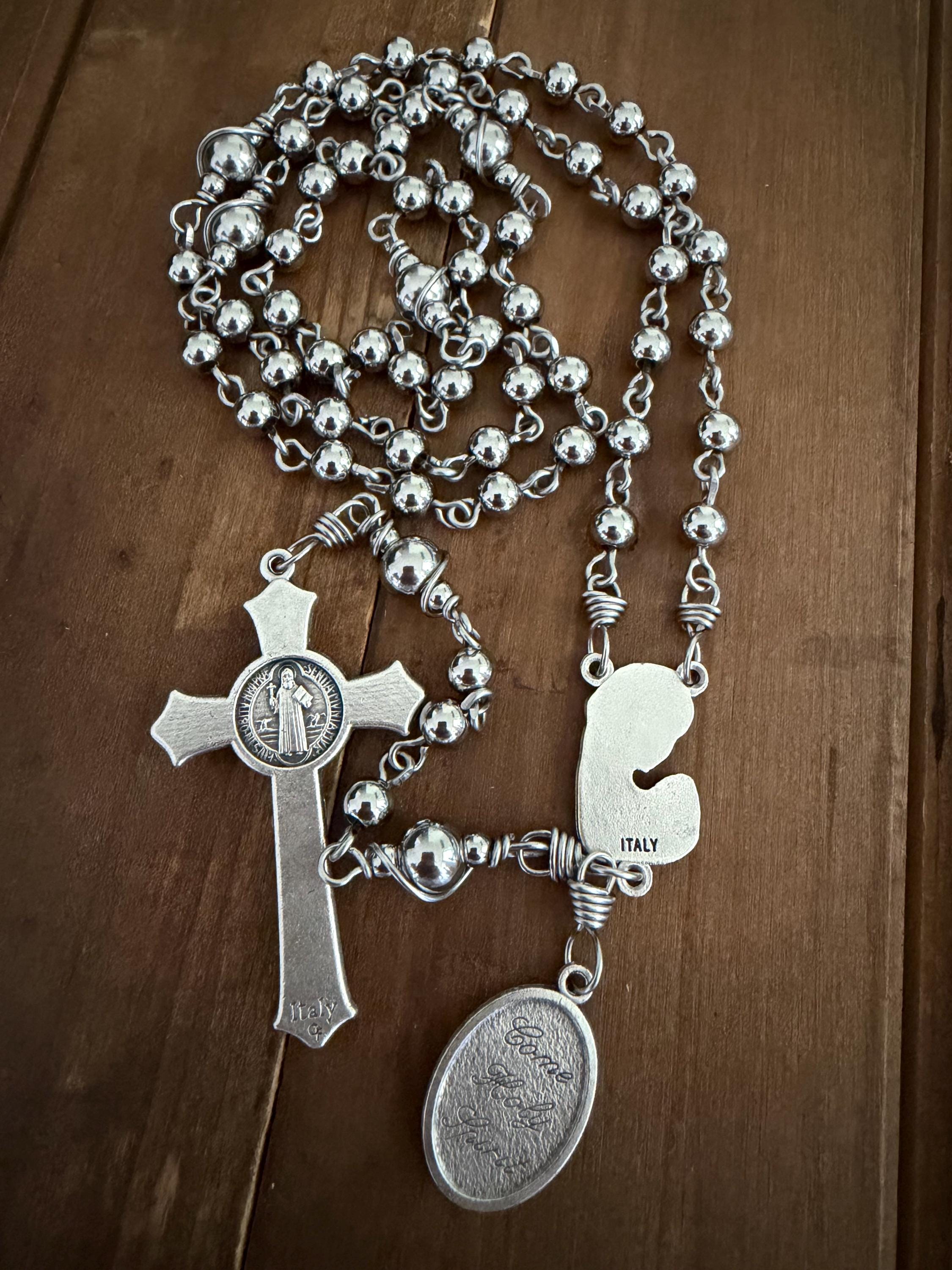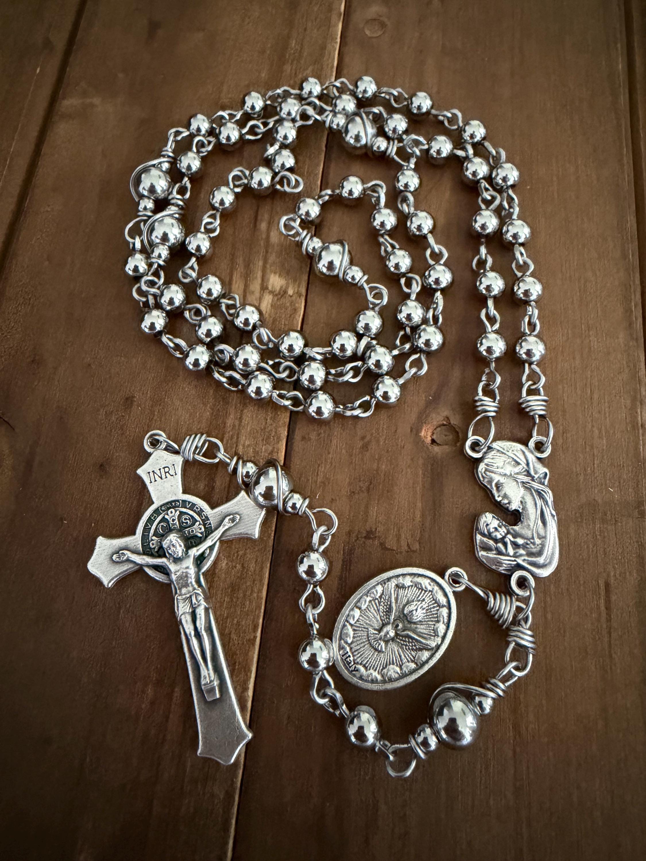 This beautiful handmade rosary is made with 6mm Stainless Steel beads, 8mm Our Father stainless steel beads, Stainless Steel wire, 1” Center medal, and 2” crucifix.